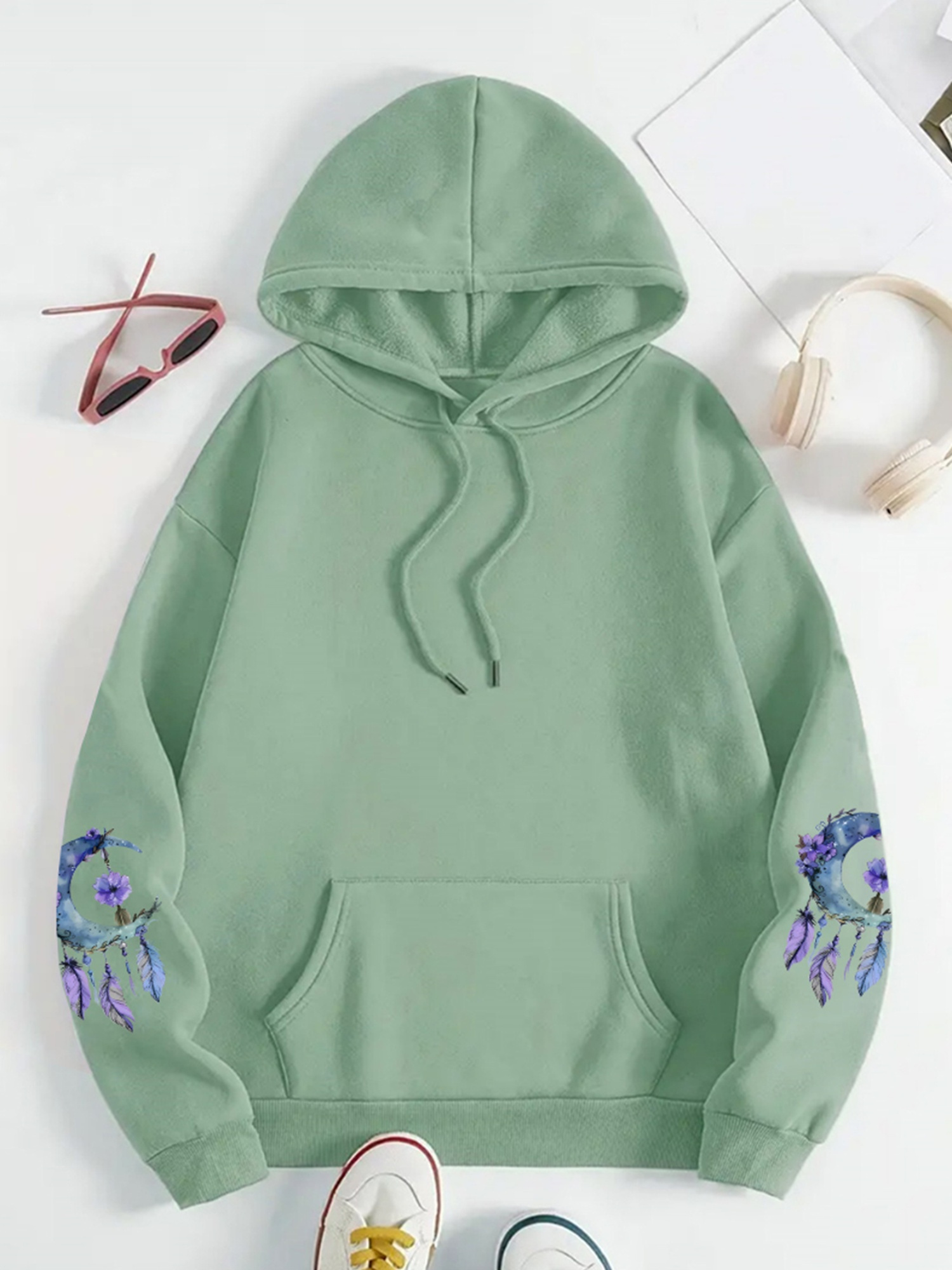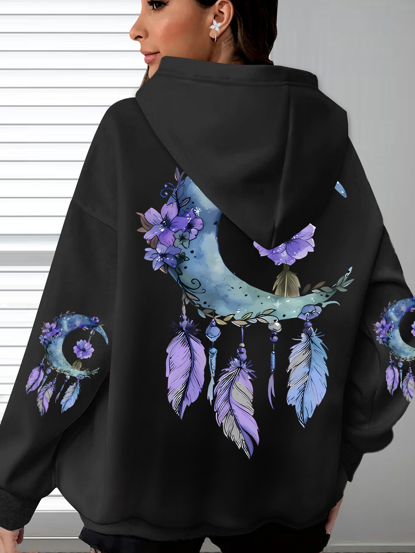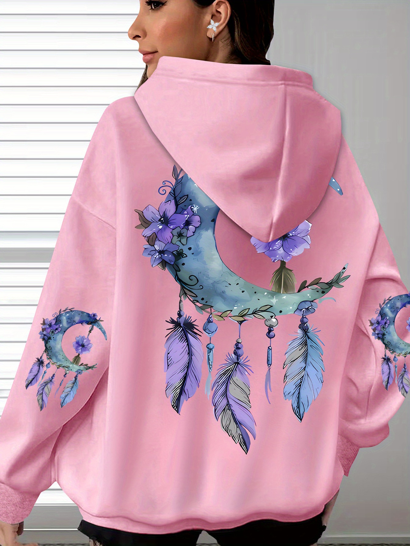[Floral Moon Hoodie] Soft & Comfortable Plus Size Women's Floral Moon & Hoodie | Casual Long Sleeve Pullover with Pockets, Oversized Daily Wear, Purple & Blue Design