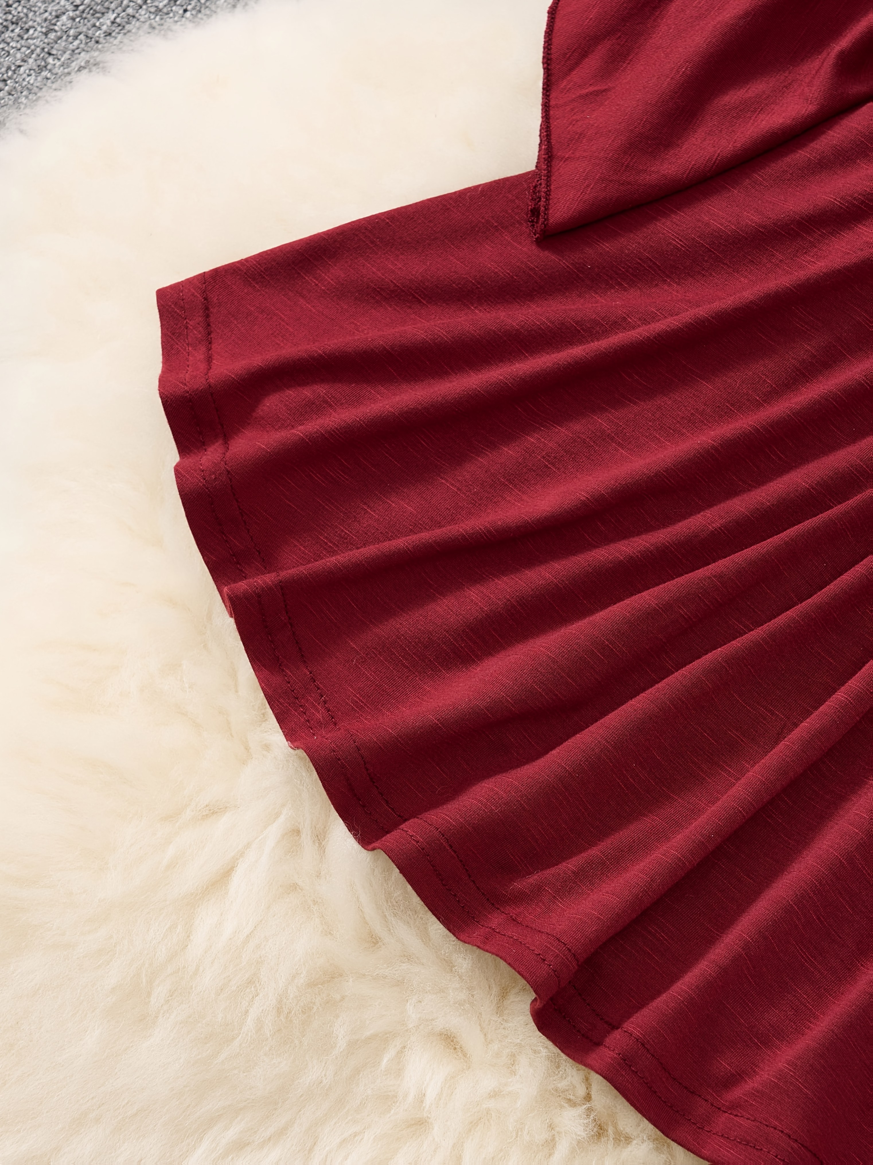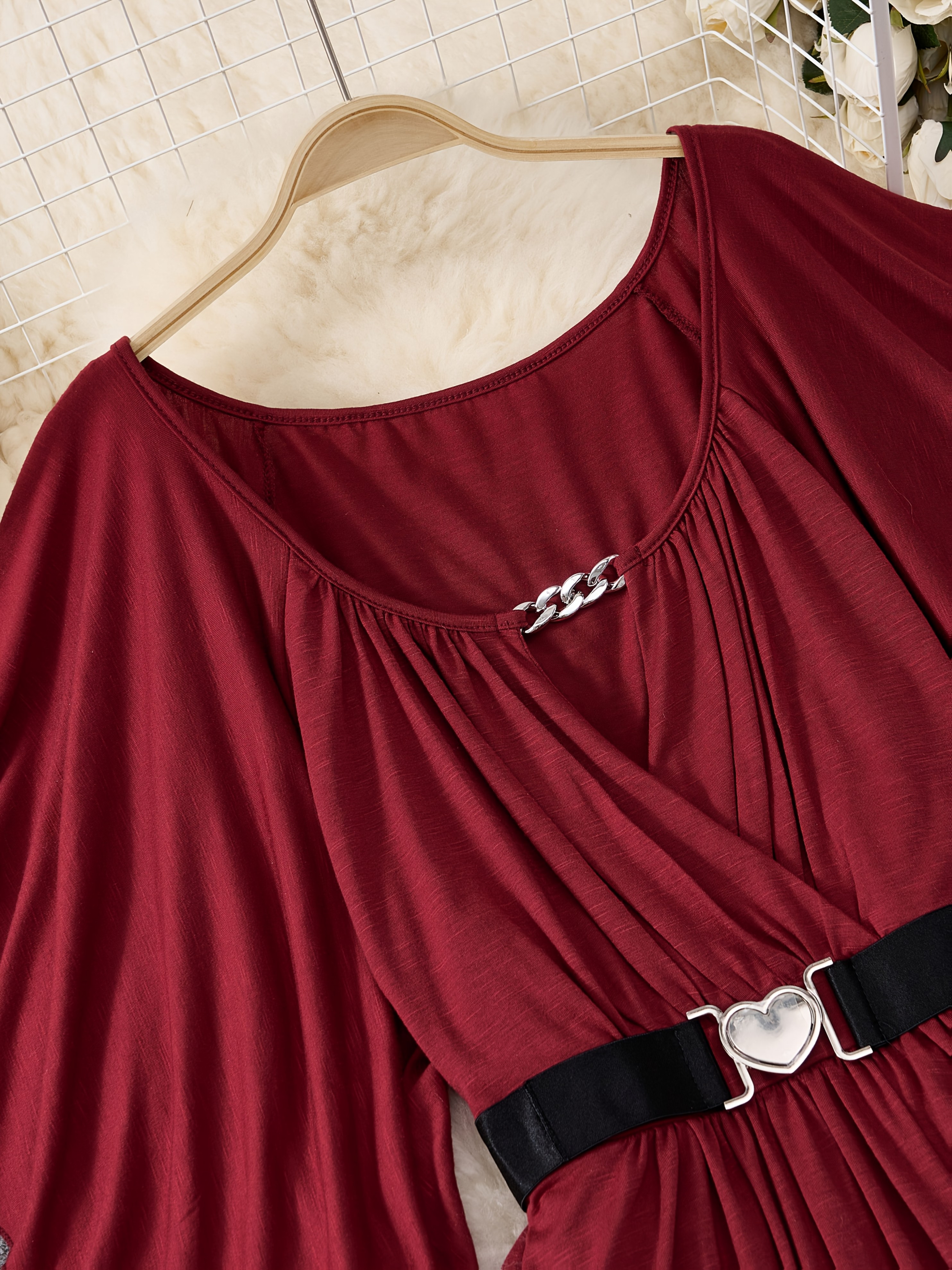 Plus Size - Elegant Plus Size V-Neck Long Sleeve Top with Heart Waist Belt - Stretchy Solid Color, Asymmetrical Hem, All-Season Fashion, Versatile for Casual or Formal Wear, Versatile Fashion | Asymmetrical Hemline | Comfortable Fit