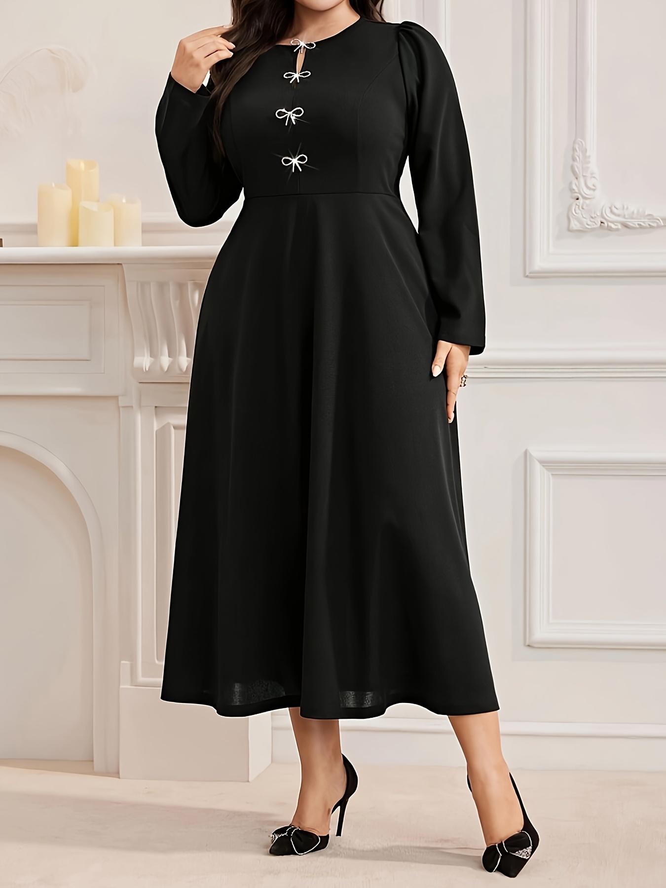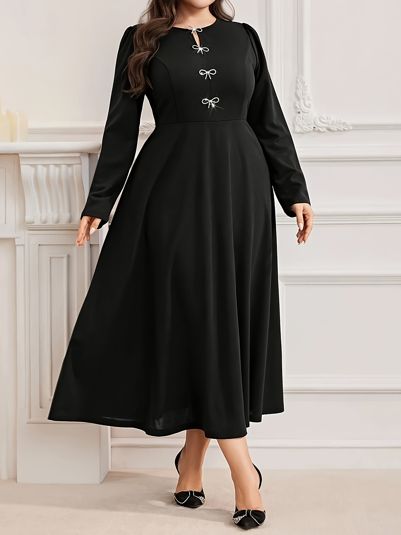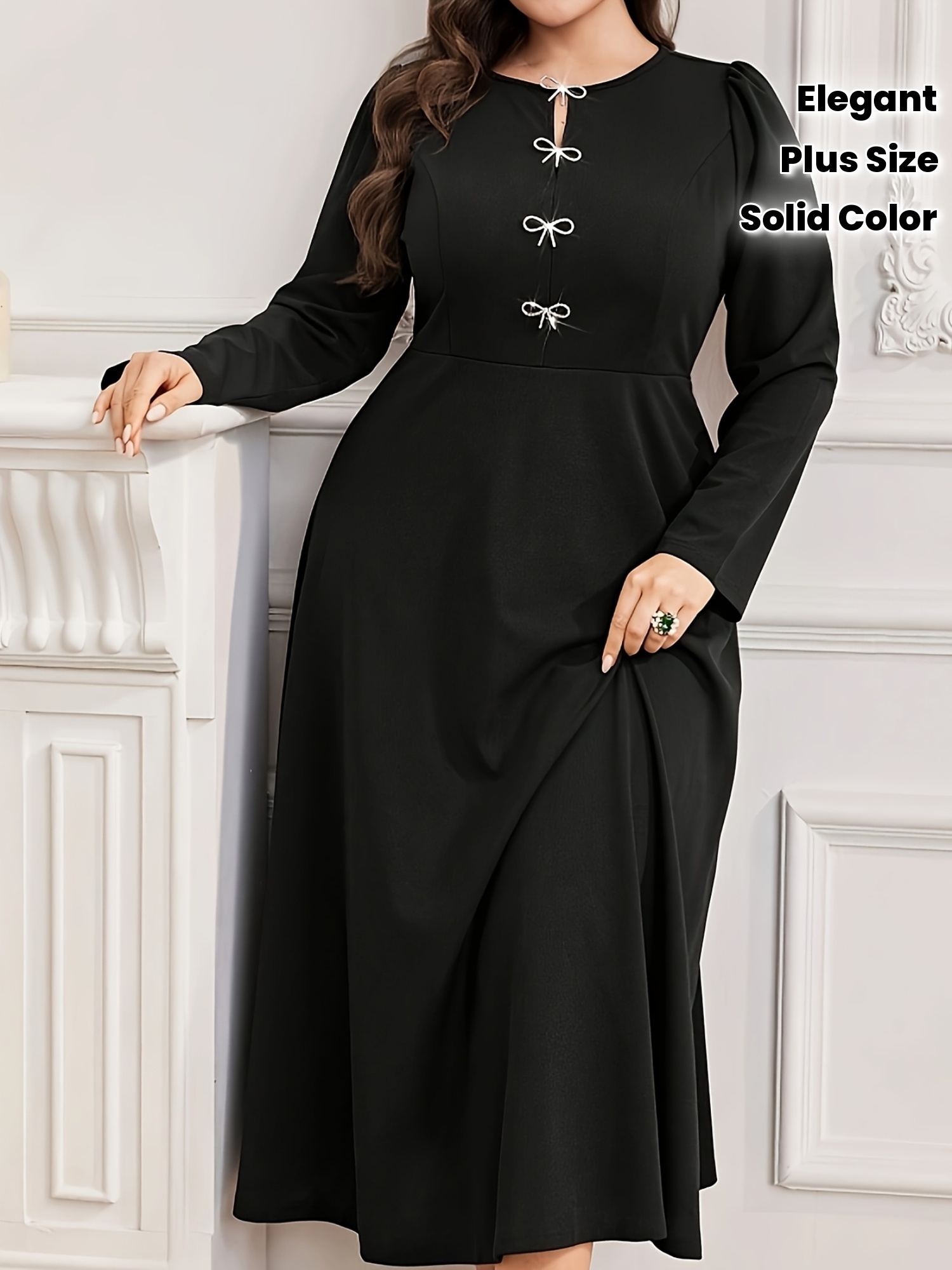 Plus Size - Elegant Plus Size Women'S Solid Color Dress with Front Bow Detail - Comfortable, Breathable, Long Sleeve, Flared Hem, Round Neck, All-Season Wear, Formal Attire|Elegant Dress|Comfortable Fit