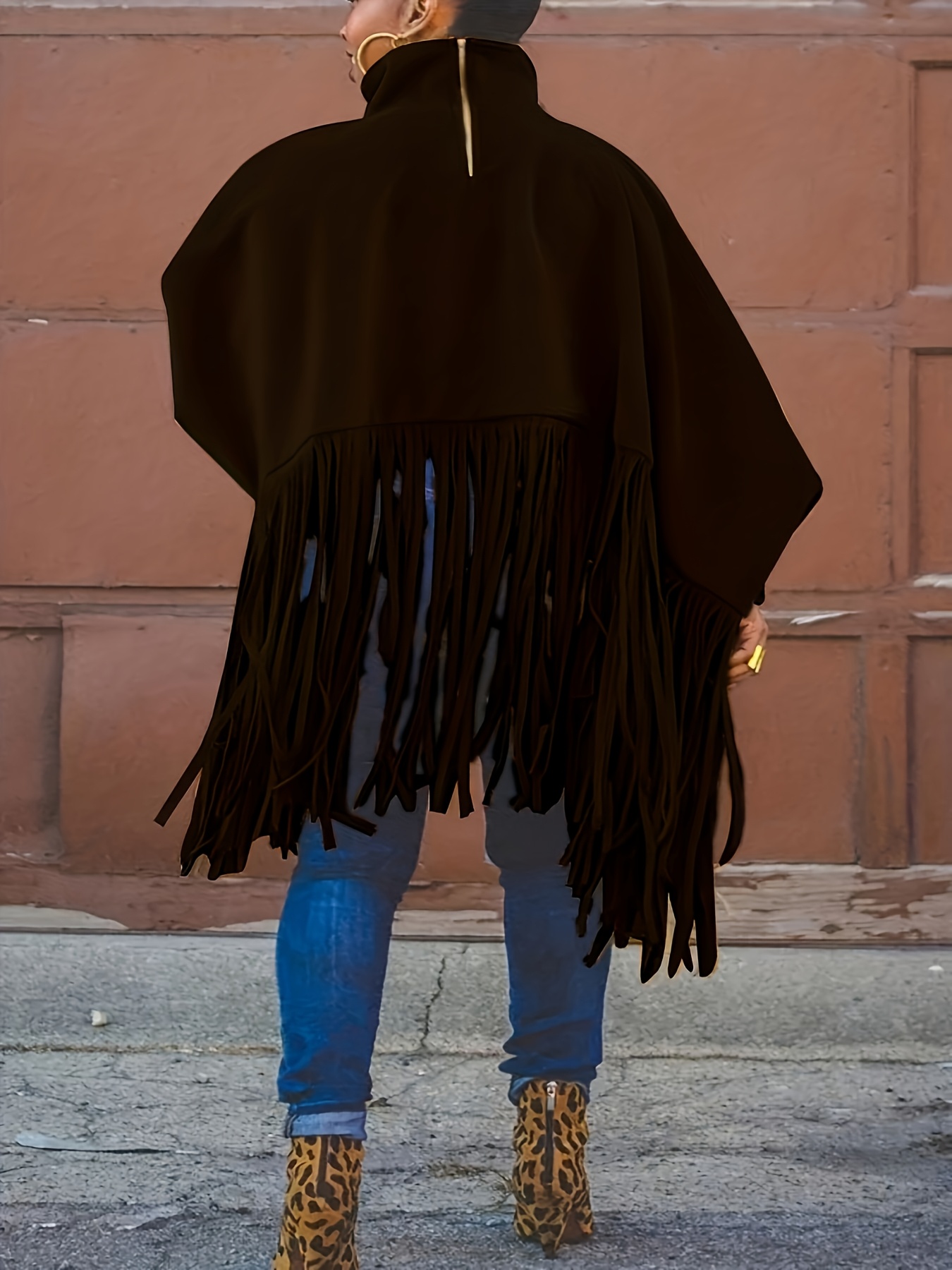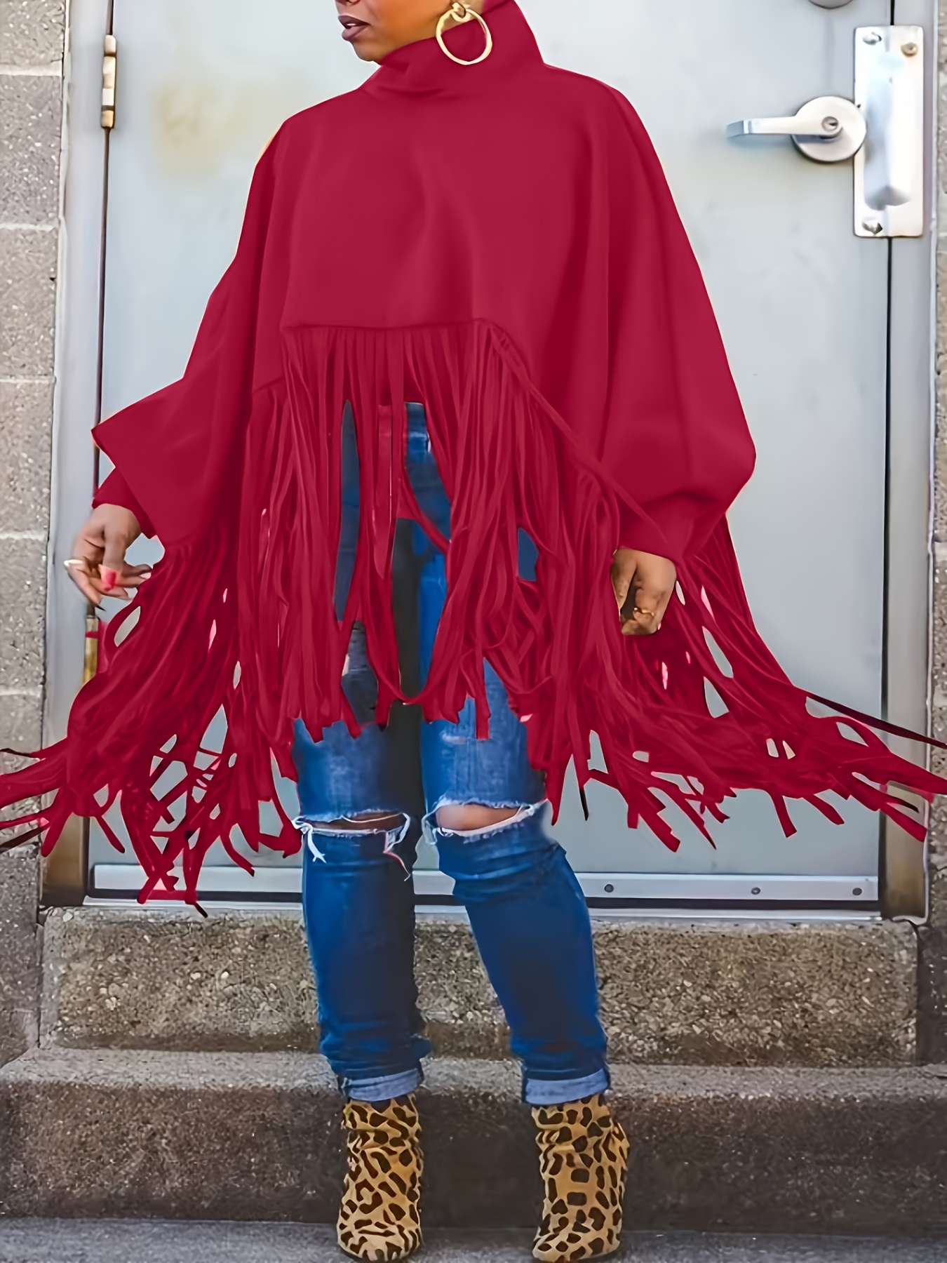 [Plus Size Tassel Top] Plus Size Women's Tassel Top - Vibrant Red Retro Chic Oversized High Neck Long Sleeve Blouse | Batwing Sleeves, Flowy Fabric, Stretchy Machine-Washable | Party & Banquet, Festive Outfit, Fall/Winter Fashion, Casual & Formal Events