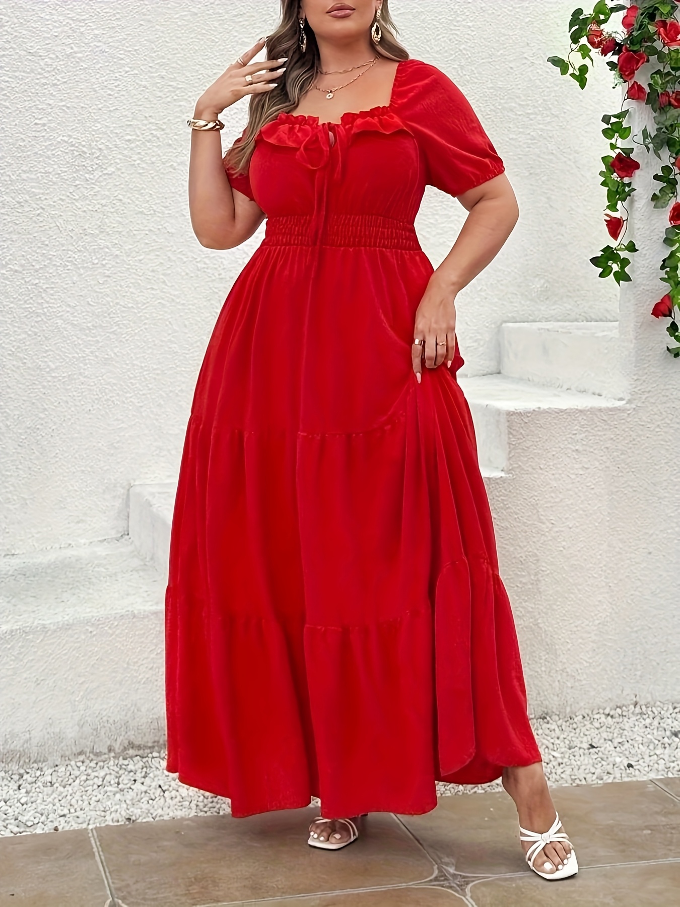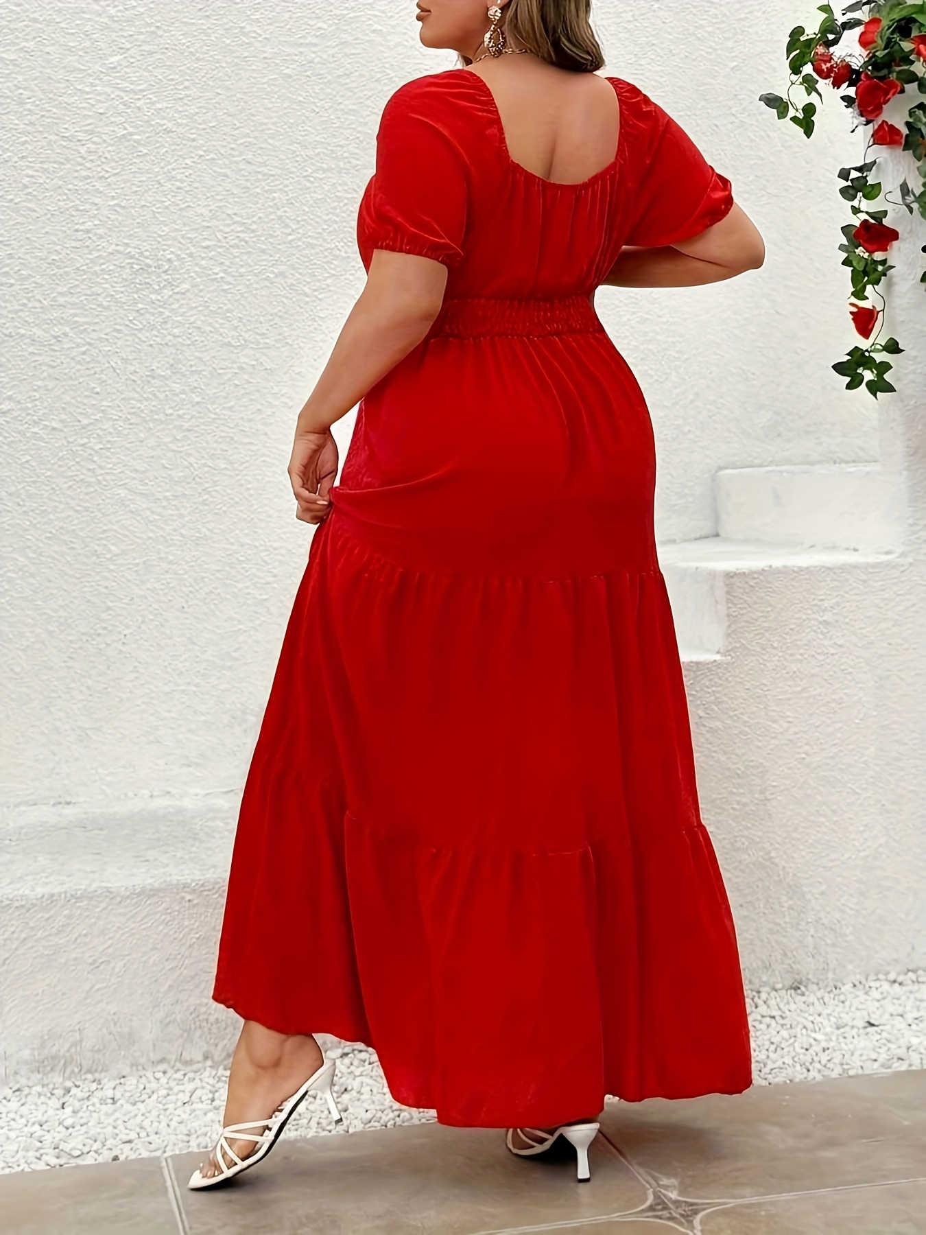 Plus Size, Women's Elegant Casual red dress - - Square Neckline, Flowy A-Line Midi skirt, Easy Everyday & Formal Outfits - - Non-Transparent Smooth Fabric - - Year-Round Wardrobe
