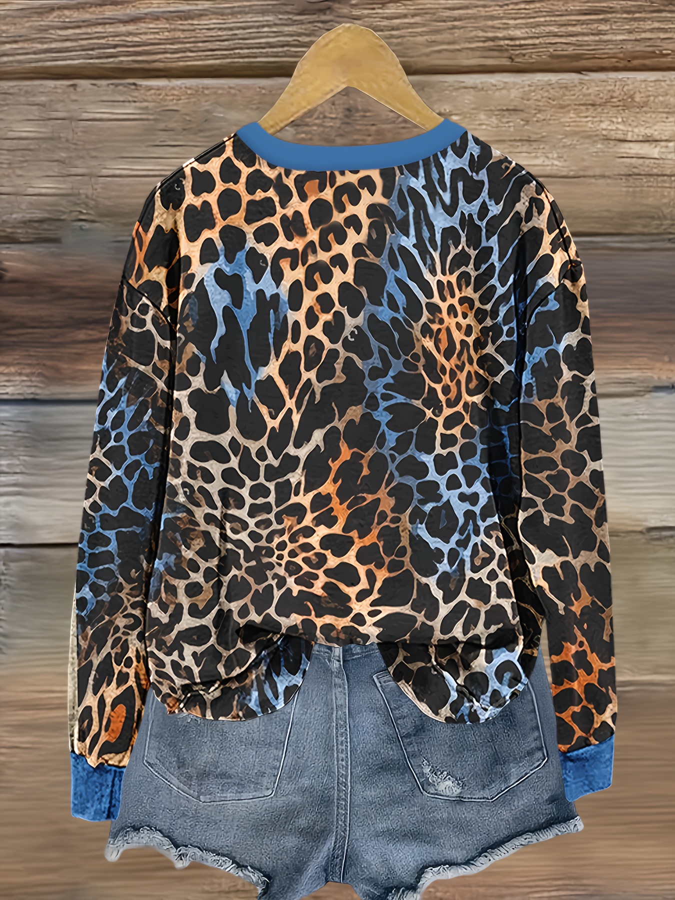 Plus Size, Women's Leopard Print Sweatshirt - Bold Black, Relaxed Fit Long Sleeve Pullover Sweater, Machine Washable Everyday Casual Outfit Essential for Women, Seasonal Fashion, Trendy Design, Soft Material, Printed Sweater, Adults