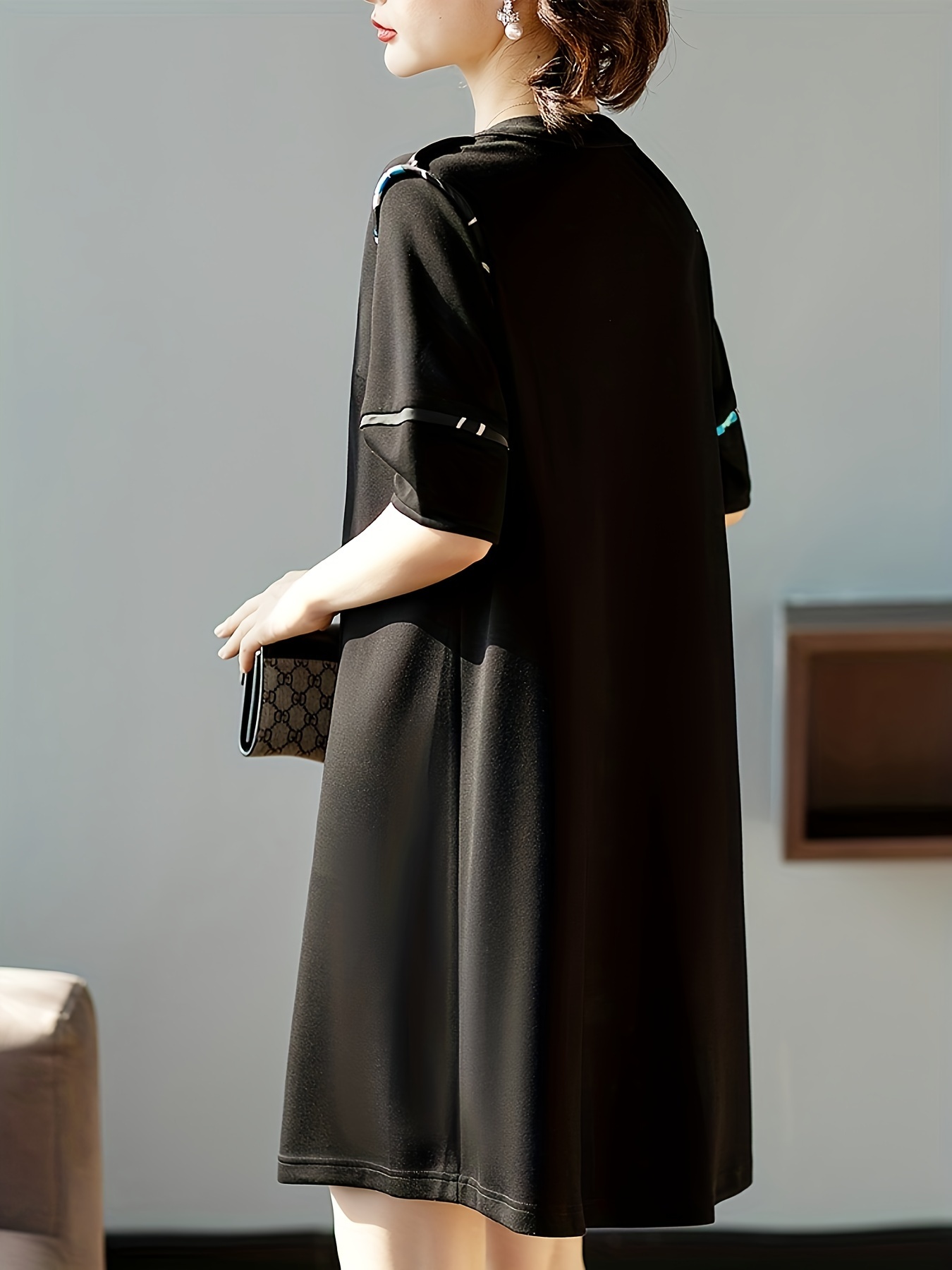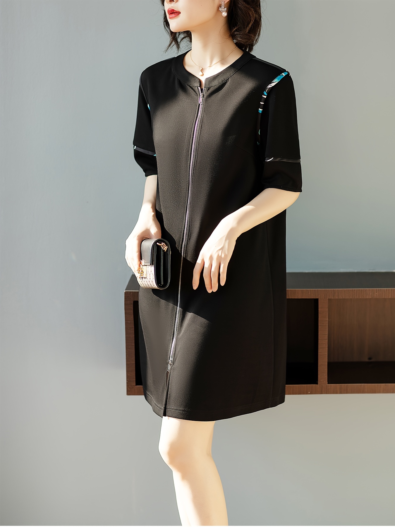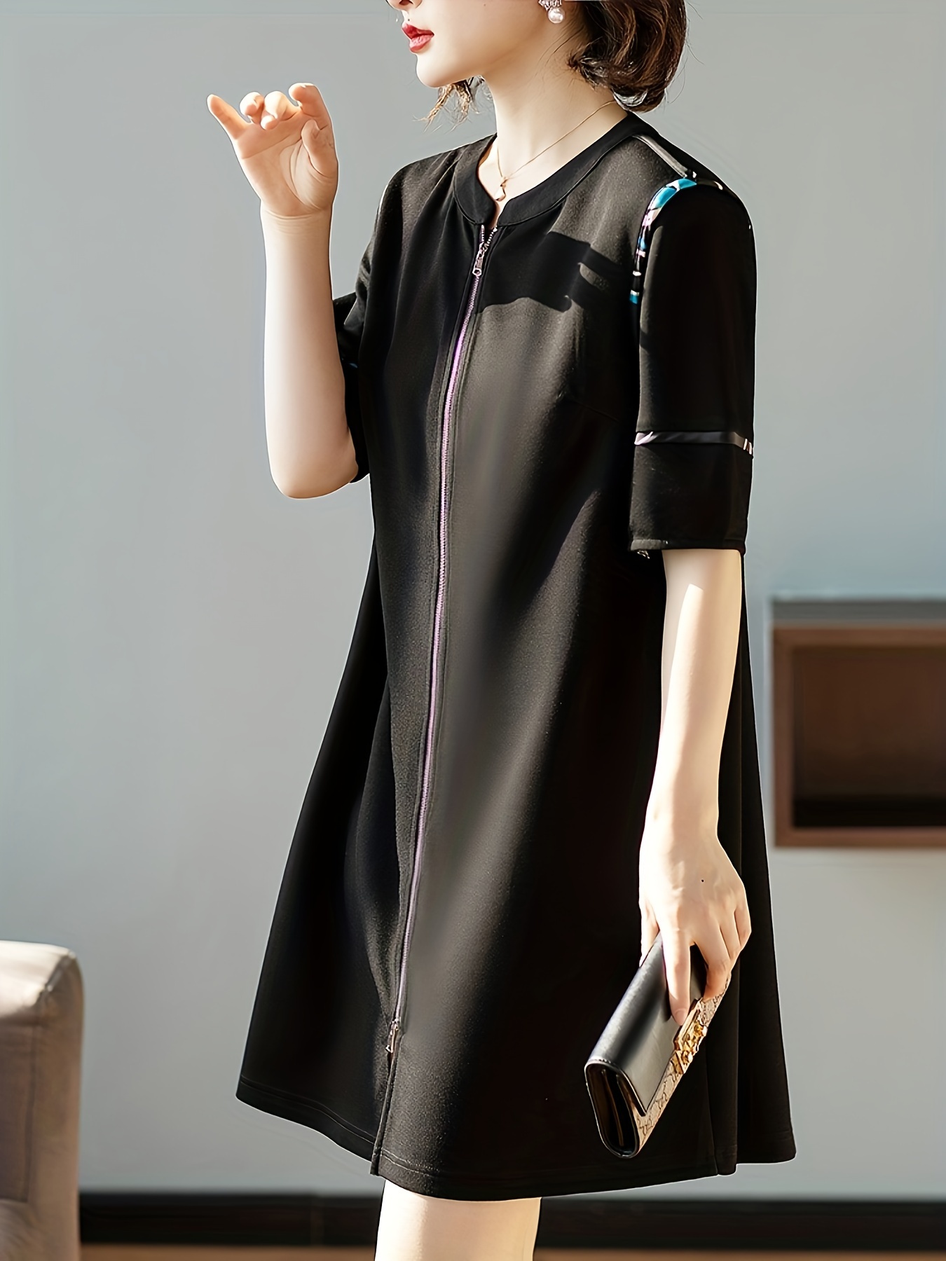 Summer Essential, Chic Black Zip-Up Dress for Women - Casual Summer Fashion with Round Neck, Stretchy Polyester Blend, Non-Sheer, Plus Size Summer Dresses