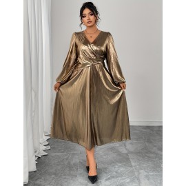 Plus Size - Elegant Plus Size V-Neck Long Sleeve Dress with Puff Sleeves and Cinched Waist - Golden, Flowing A-Line Silhouette, Perfect for Formal Occasions, Formal Evening Wear | Vneck Dress | Glossy Texture