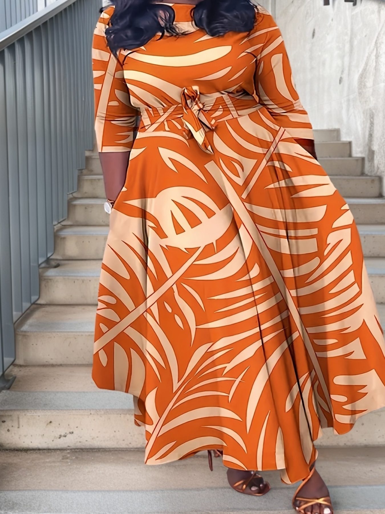 Tropical Print Maxi Dress for Women - Casual Crew Neck, 5-Point Sleeve with Tie Waist, Plus Size, Vibrant Orange & Yellow Leaf Pattern, All-Season Comfort