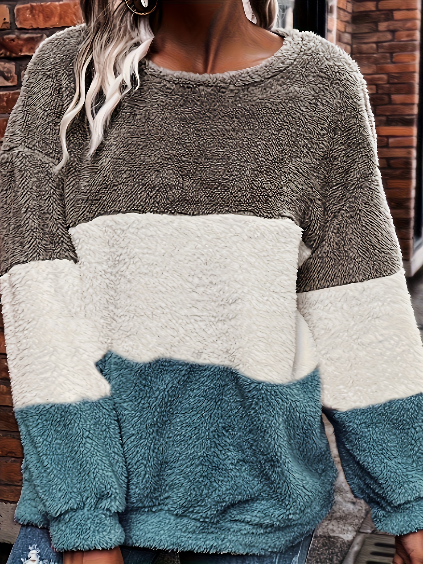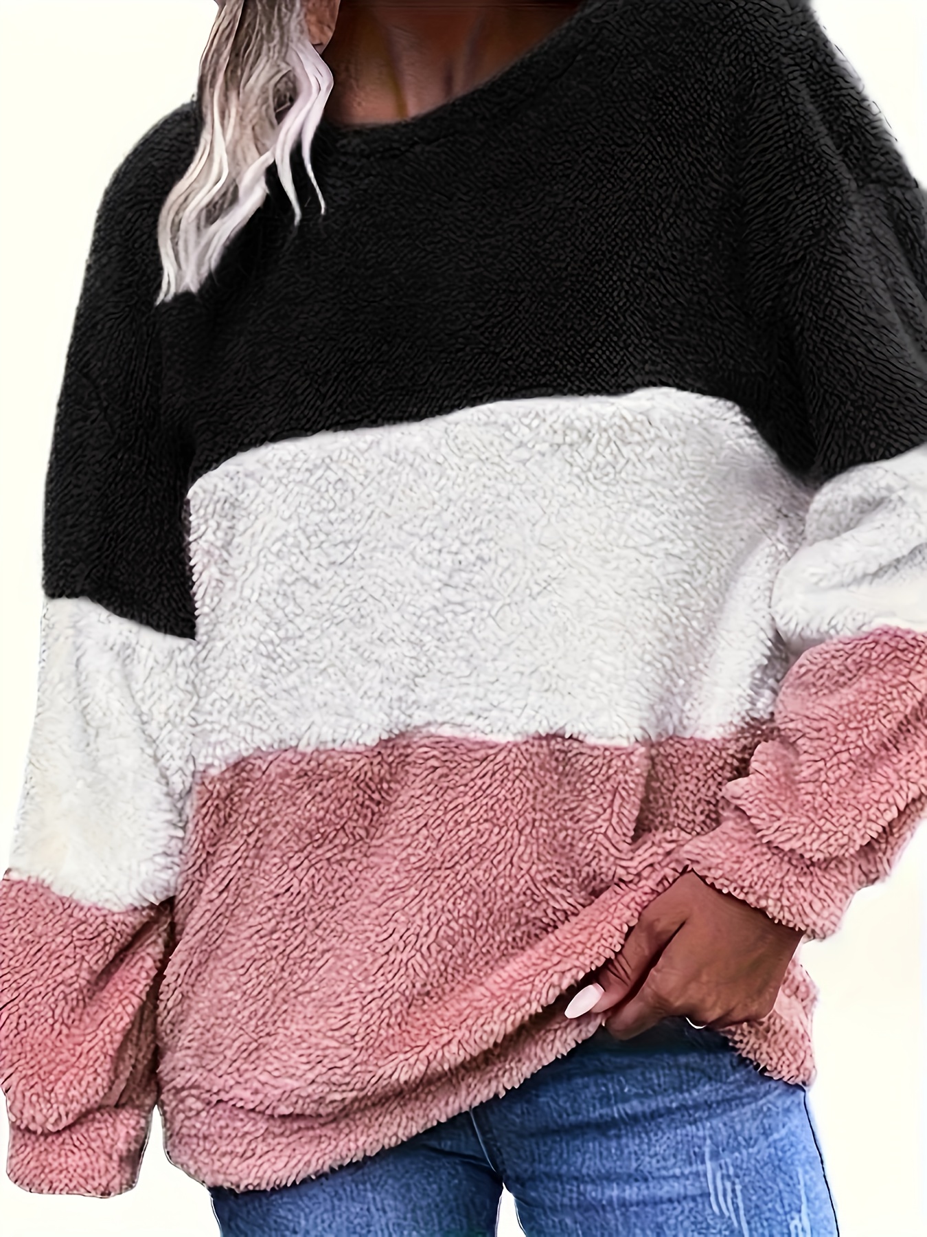 [Plus Size Fleece Hoodie] Cozy Plus Size Women's Plush Fleece Hoodie | Color Block Striped Loose Fit Pullover, Round Neck & Machine Washable | Casual Fall Winter Fashion Top, Comfortable Clothing, Nontransparent Material