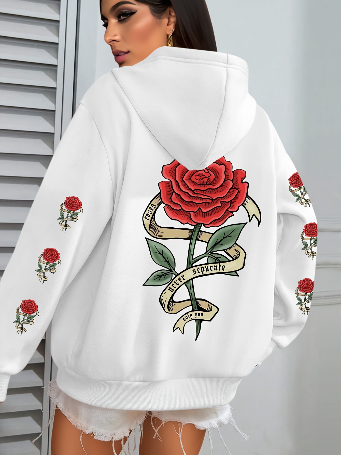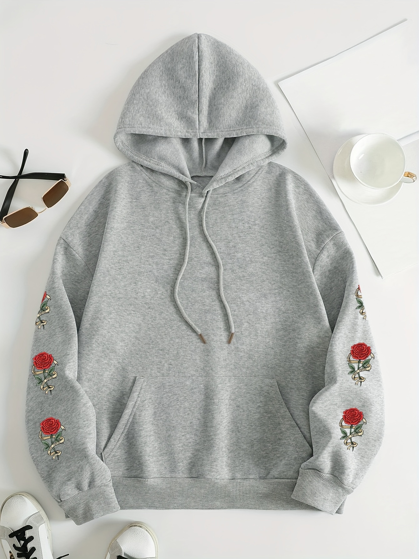 Plus Size Floral Rose Print Hoodie - Cozy, Stylish, 100% Polyester Knit Fabric, Slight Stretch for Fall/Winter