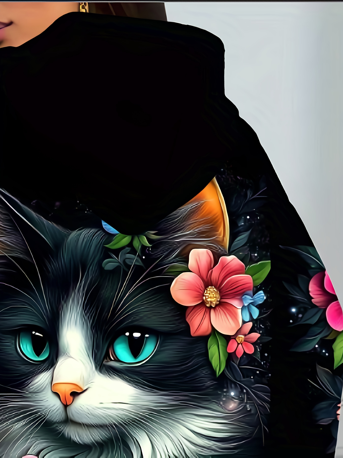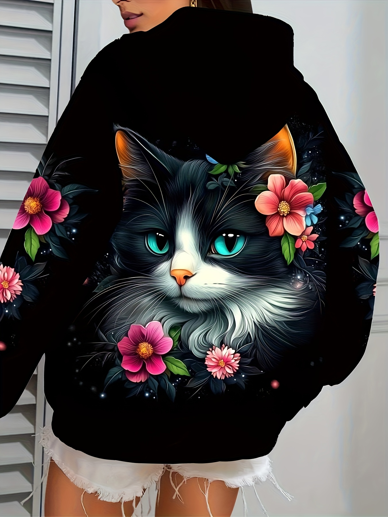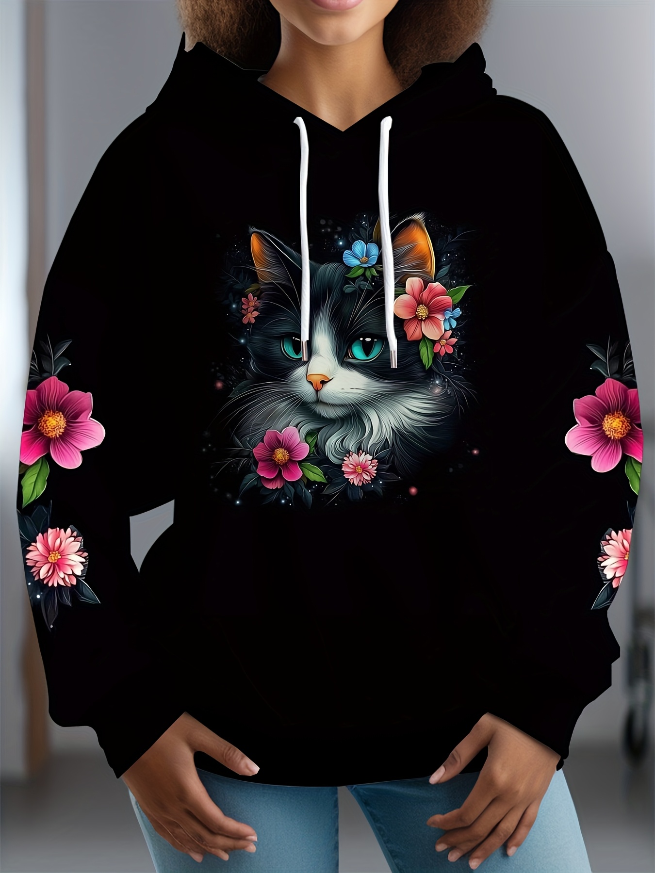 Plus Size - Women'S Plus Size Floral Cat Print Hoodie - Black Pullover Sweatshirt with Blue Eyes, Cozy Fall Winter Hooded Sweater for Everyday & Formal Outfits, Cute Cat Lover Gift, Casual Wear, Playful Design, Comfortable Fabric, Stylish Hooded Top, Fashion Enthusiasts, Cat Sqeatshirt, Curvy Sweatshirt For Women, Hoodie For Women Plus Size, Sweatshirt For Women, Pull For Women Plus Size, Pullover Women Large Size, Sweatshirt Women Large Size, Hoodie Women Large Size