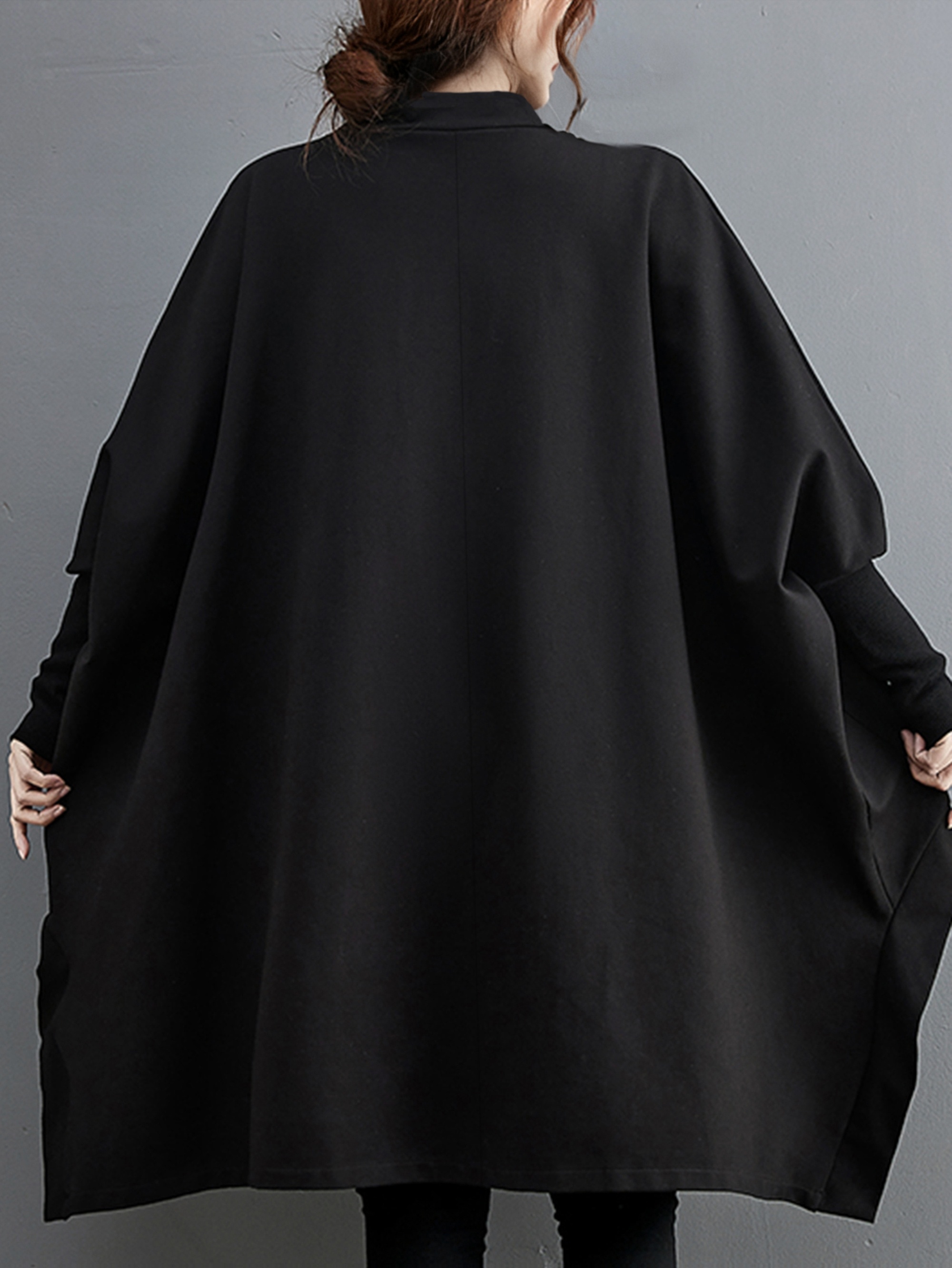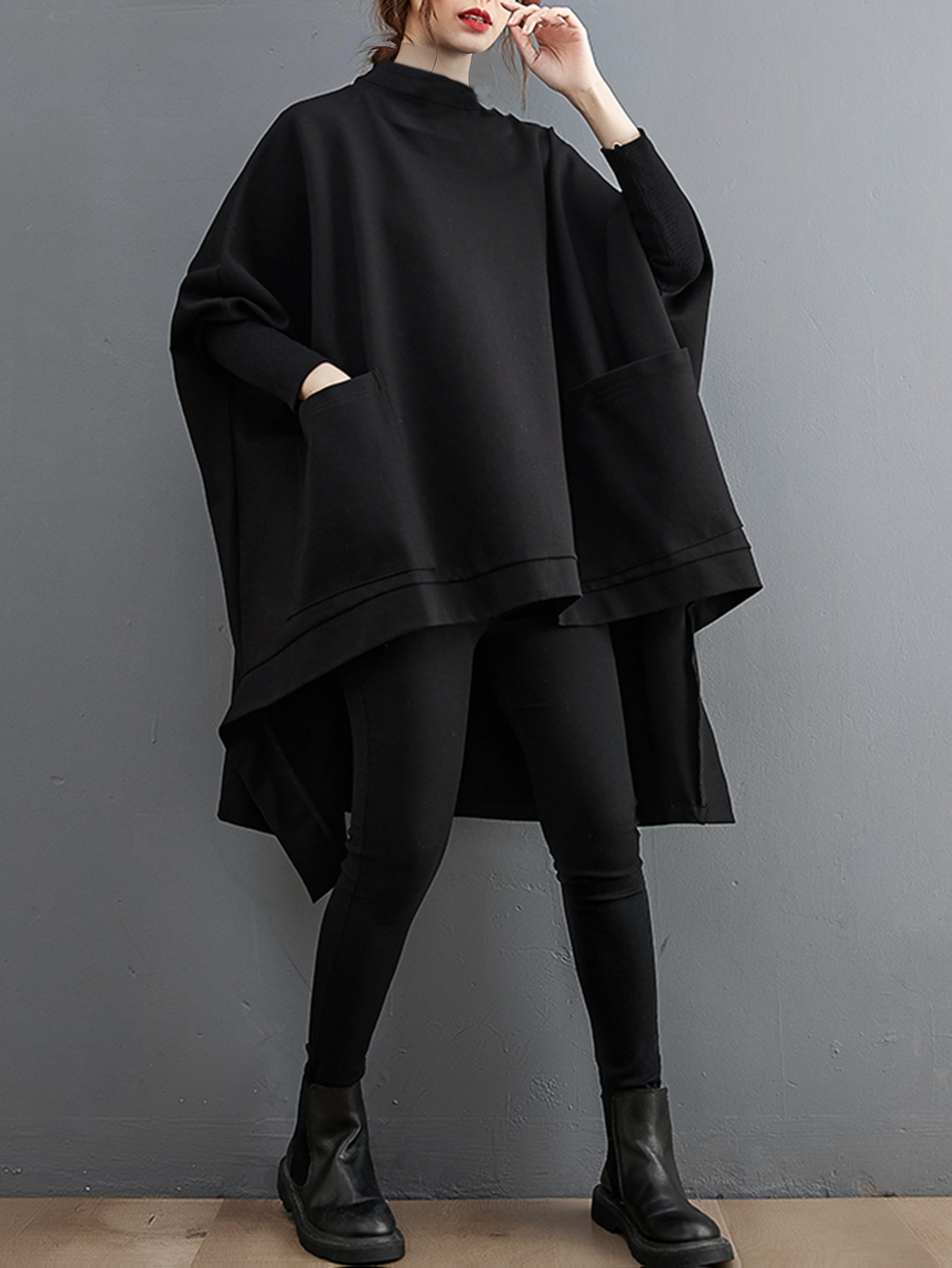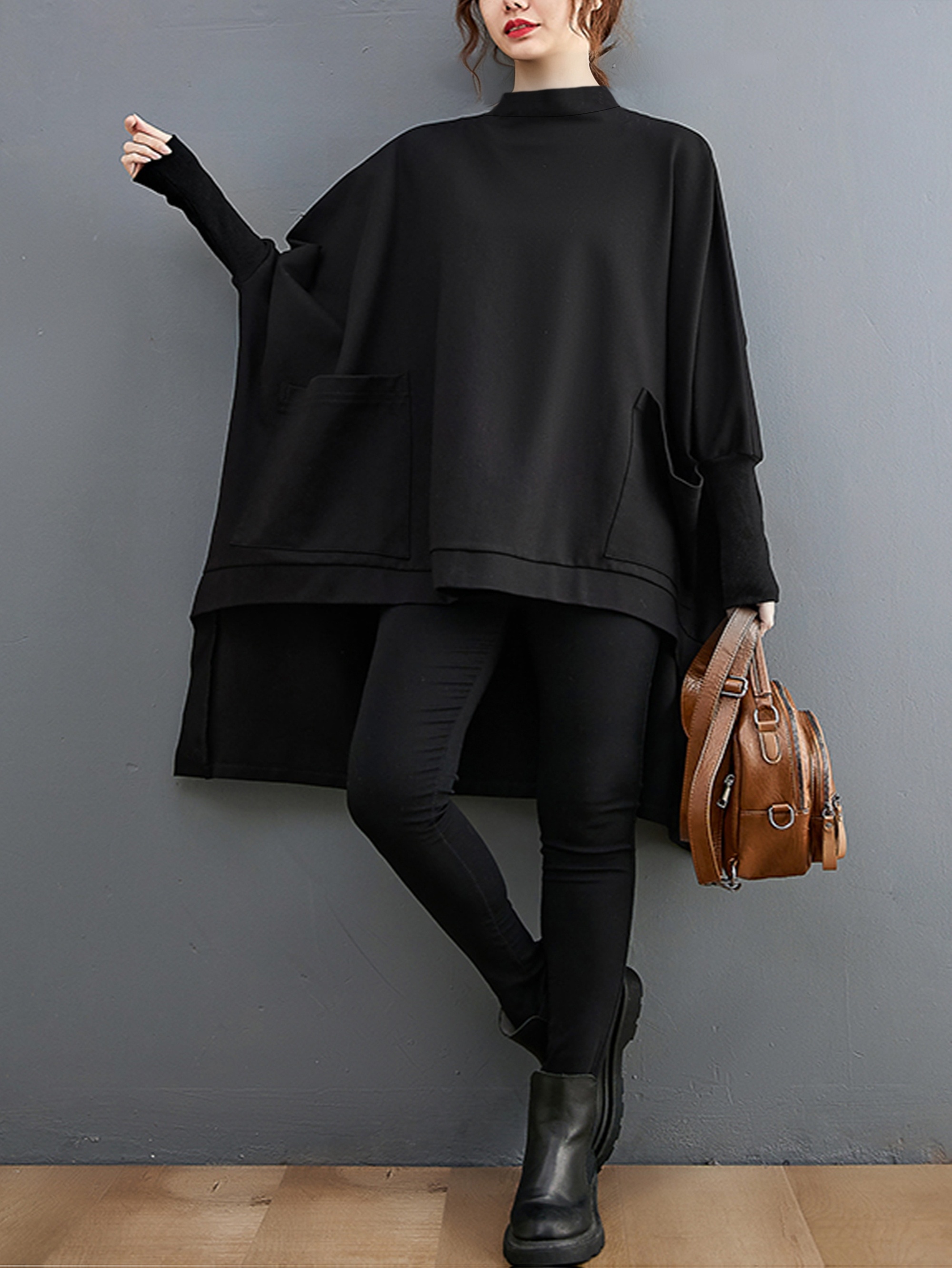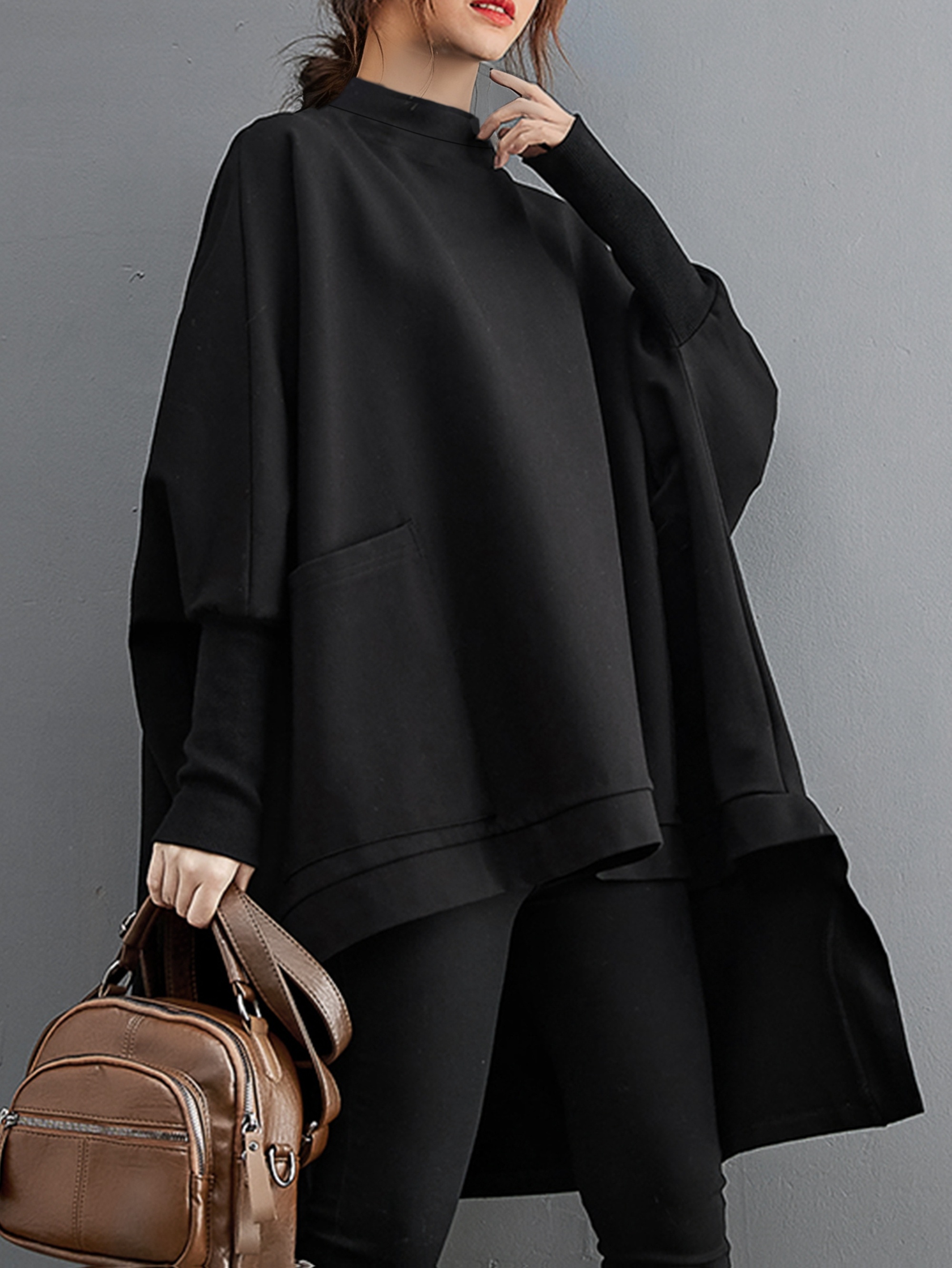 Plus Size - Plus Size Women'S High Neck Batwing Sleeve T-Shirt - Stretchy Fleece-Lined Mid-Length Top with Asymmetrical Hem, Casual Chic Solid Color Design for Fall/Winter, Versatile Layering Piece, Winter Clothing | Asymmetrical Hemline