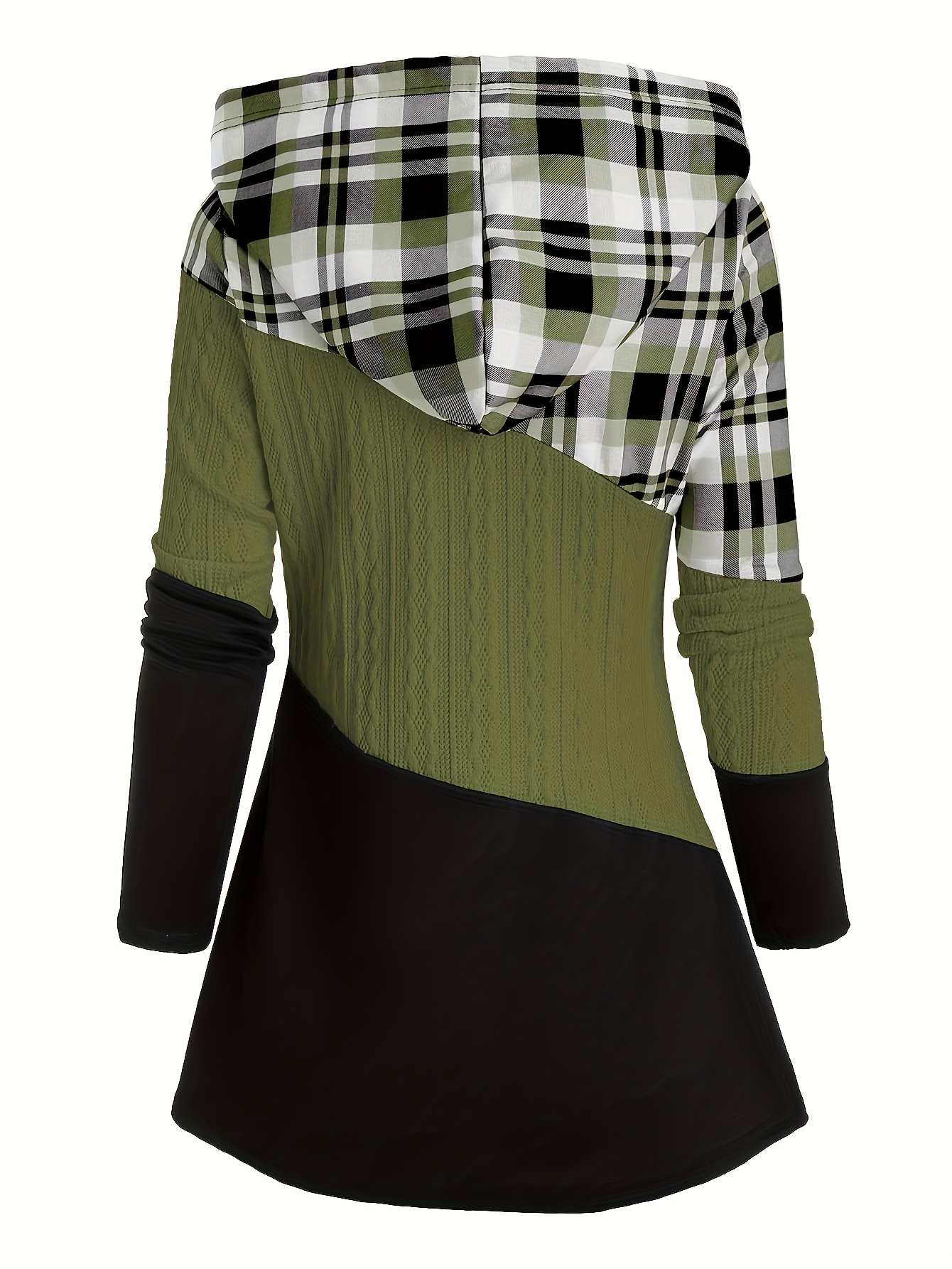 Plus Size - Plus Size Women'S Plaid Hooded Sweater - Long Sleeve Pullover with Drawstring Hood, Casual Fall/Winter Top, Pink & Checkered Pattern, Cozy Clothing | Relaxed Fit Sweater | Construction