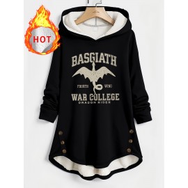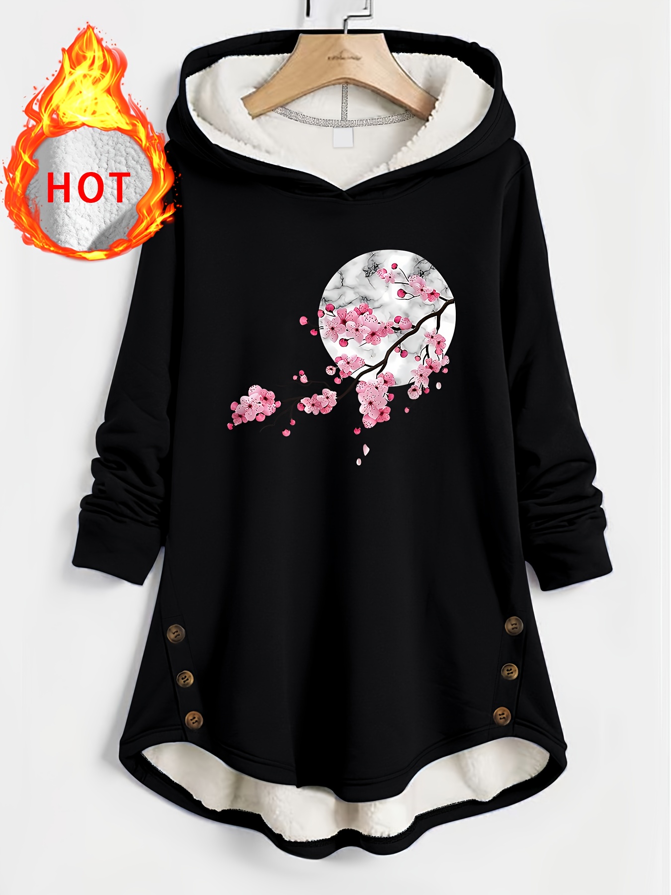 Plus Size, Women's Plus Size -Lined Hooded Button-Up Sweatshirt, Warm Autumn/Winter Hooded Jacket, -Lined Hood, Pattern Print, Comfortable Fit, Machine Washable, Fashionable for Fall/Winter Weather, Button Decoration, Durable Fabric