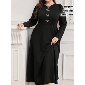 Plus Size - Elegant Plus Size Women'S Solid Color Dress with Front Bow Detail - Comfortable, Breathable, Long Sleeve, Flared Hem, Round Neck, All-Season Wear, Formal Attire|Elegant Dress|Comfortable Fit