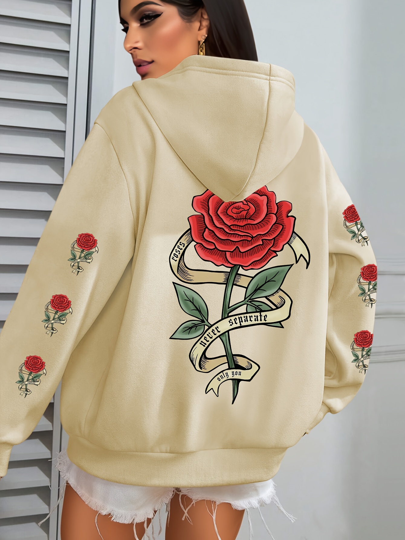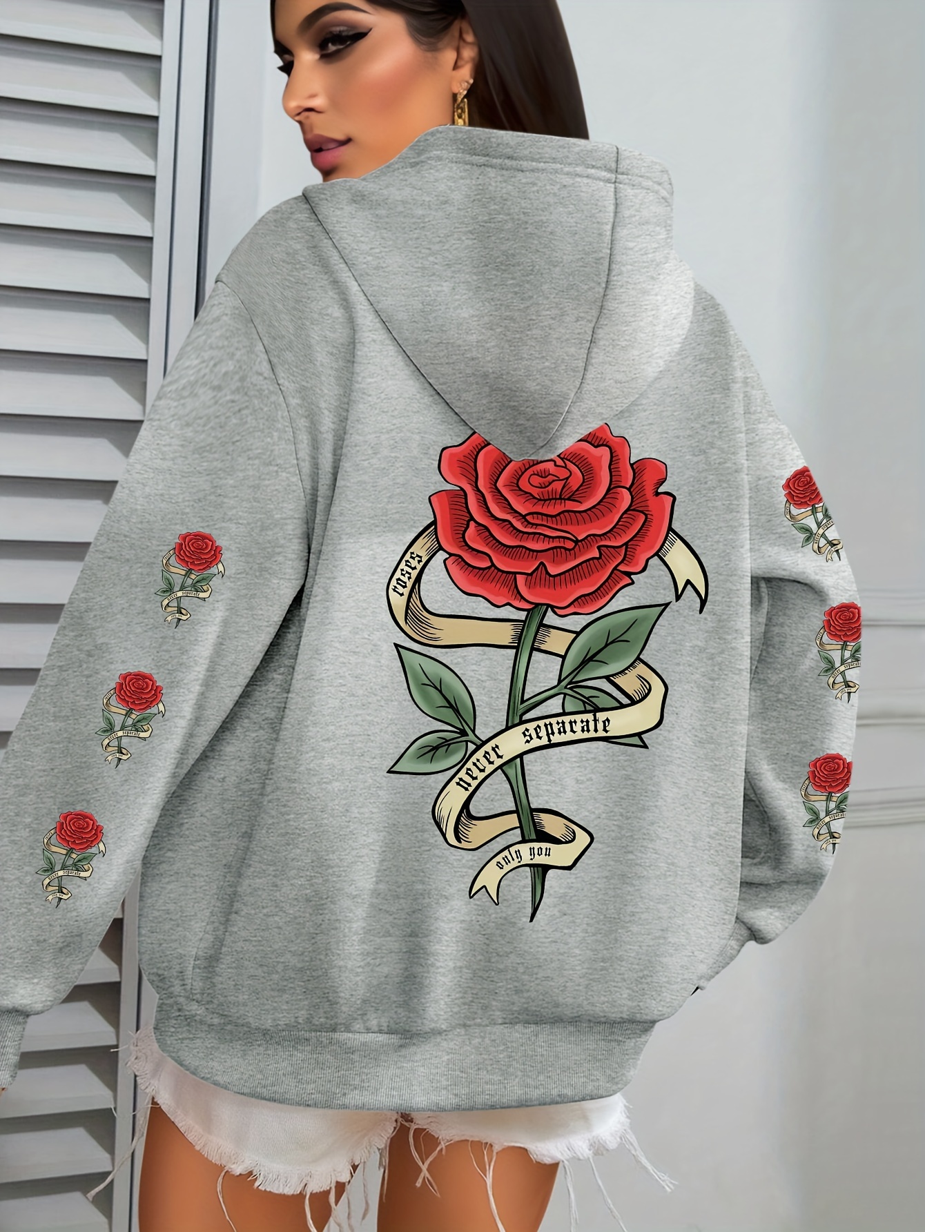Plus Size Floral Rose Print Hoodie - Cozy, Stylish, 100% Polyester Knit Fabric, Slight Stretch for Fall/Winter