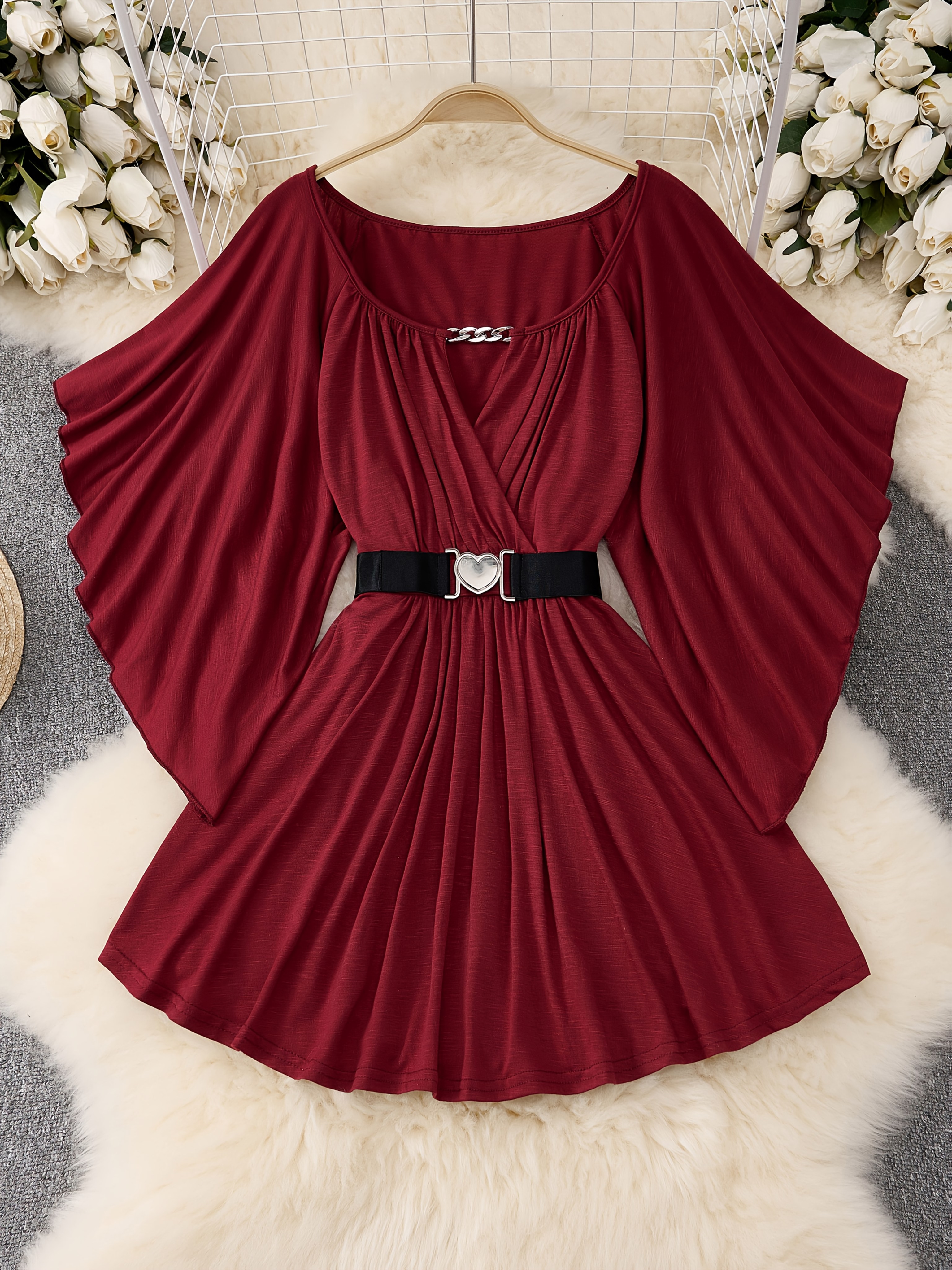 Plus Size - Elegant Plus Size V-Neck Long Sleeve Top with Heart Waist Belt - Stretchy Solid Color, Asymmetrical Hem, All-Season Fashion, Versatile for Casual or Formal Wear, Versatile Fashion | Asymmetrical Hemline | Comfortable Fit