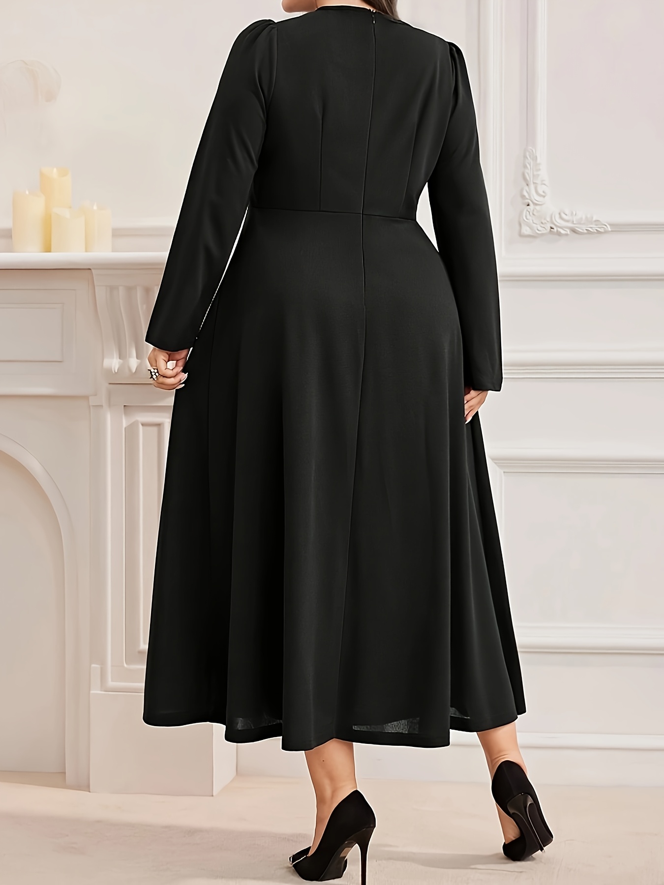 Plus Size - Elegant Plus Size Women'S Solid Color Dress with Front Bow Detail - Comfortable, Breathable, Long Sleeve, Flared Hem, Round Neck, All-Season Wear, Formal Attire|Elegant Dress|Comfortable Fit