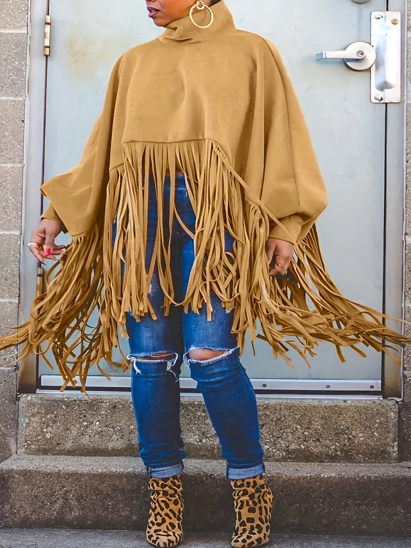 [Plus Size Tassel Top] Plus Size Women's Tassel Top - Vibrant Red Retro Chic Oversized High Neck Long Sleeve Blouse | Batwing Sleeves, Flowy Fabric, Stretchy Machine-Washable | Party & Banquet, Festive Outfit, Fall/Winter Fashion, Casual & Formal Events
