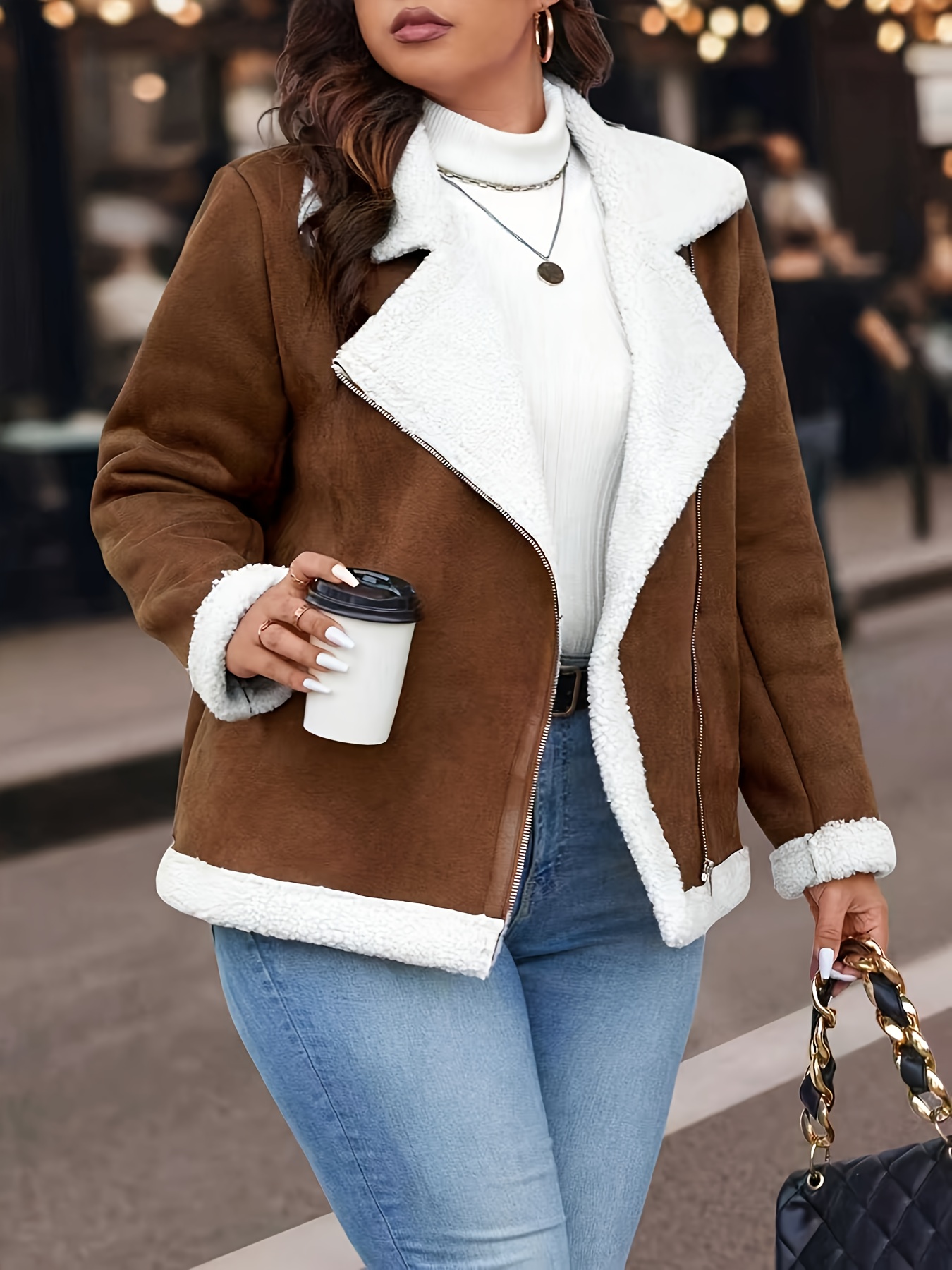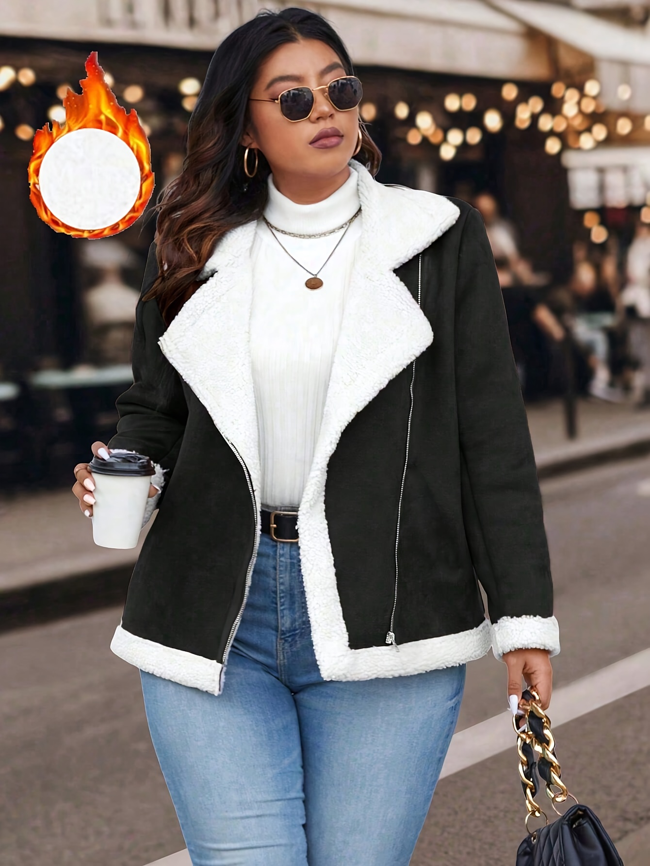 Plus Size Women'S Color Block Lapel Collar Zip-Up Jacket - Warm Fleece-Lined Casual Outerwear with Front Pockets, Solid Color Design for Fall/Winter, Cozy Layering Piece, Winter Jacket, Fall Fashion, Sporty Style, Durable Fabric