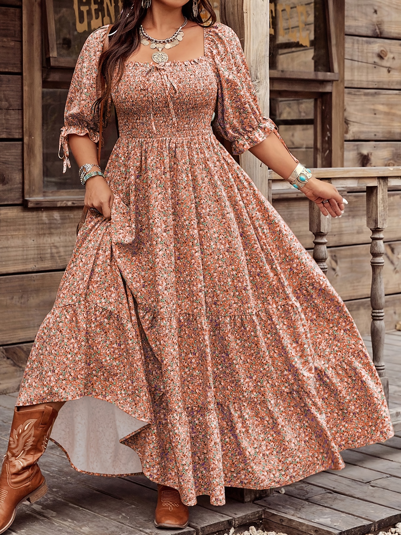 Women's Casual Floral Print Square Neck Dress with Lantern Sleeves - A-Line Silhouette, Flared Hem & Machine Washable Fabric for All-Season Wear, Versatile for Casual to Semi-Formal Occasions YZ199, Semiformal Attire, Flowy Skirt Style