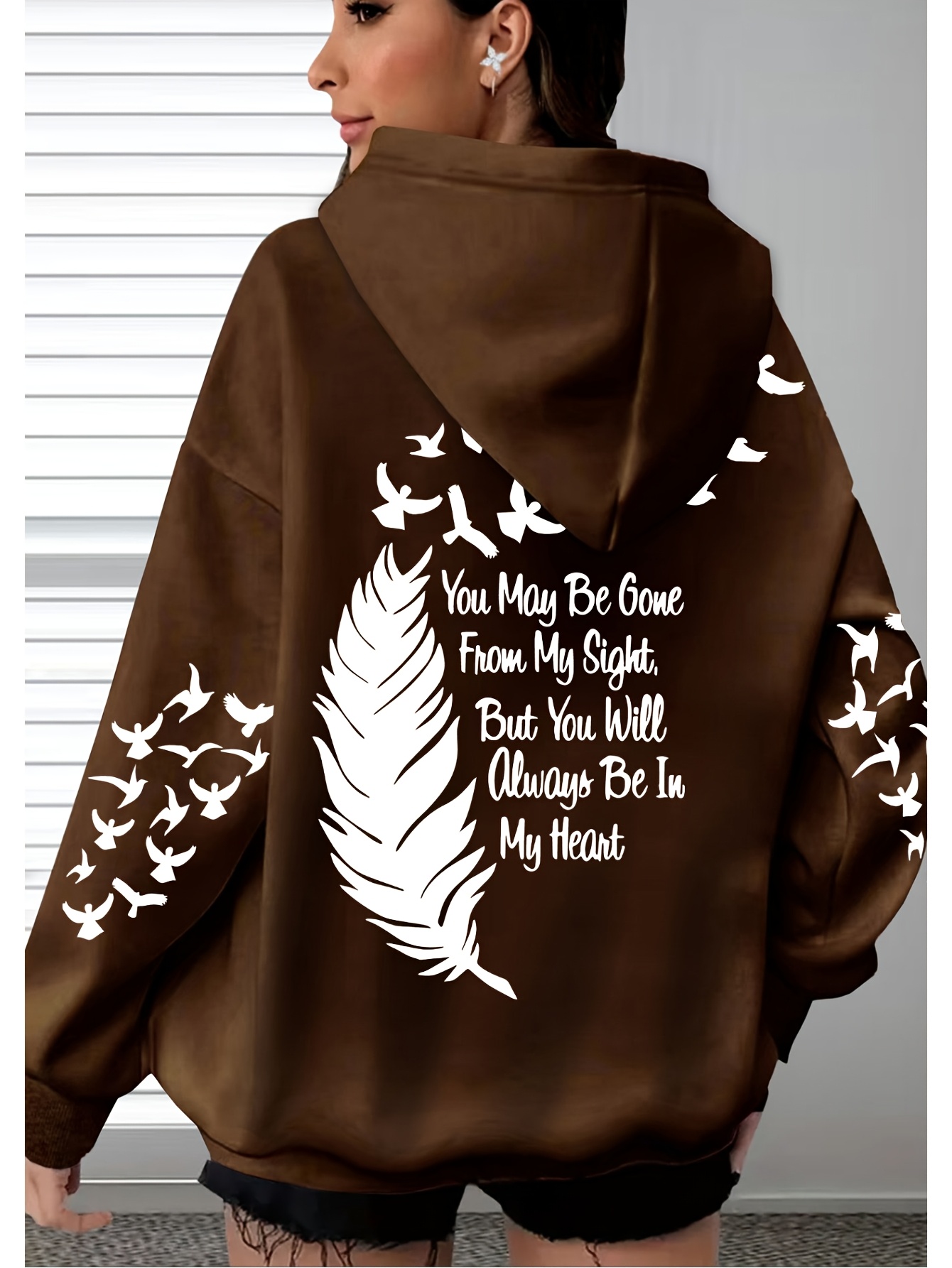 Women's Plus Size Soft Casual Hooded Sweatshirt with Artistic Back Print - Black & White & Bird Design, Kangaroo Pocket, Relaxed Fit, Machine Washable, All-Season Comfort, Ladies Sweatshirts, Decorative Text Design